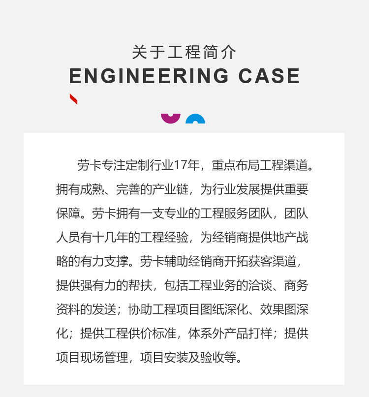 团队人员有十几年的工程经验,为经销商提供地产战略的有力支撑。凯发k8一触即发辅助经销商开拓获客渠道,提供强有力的帮扶,包括工程业务的洽谈,